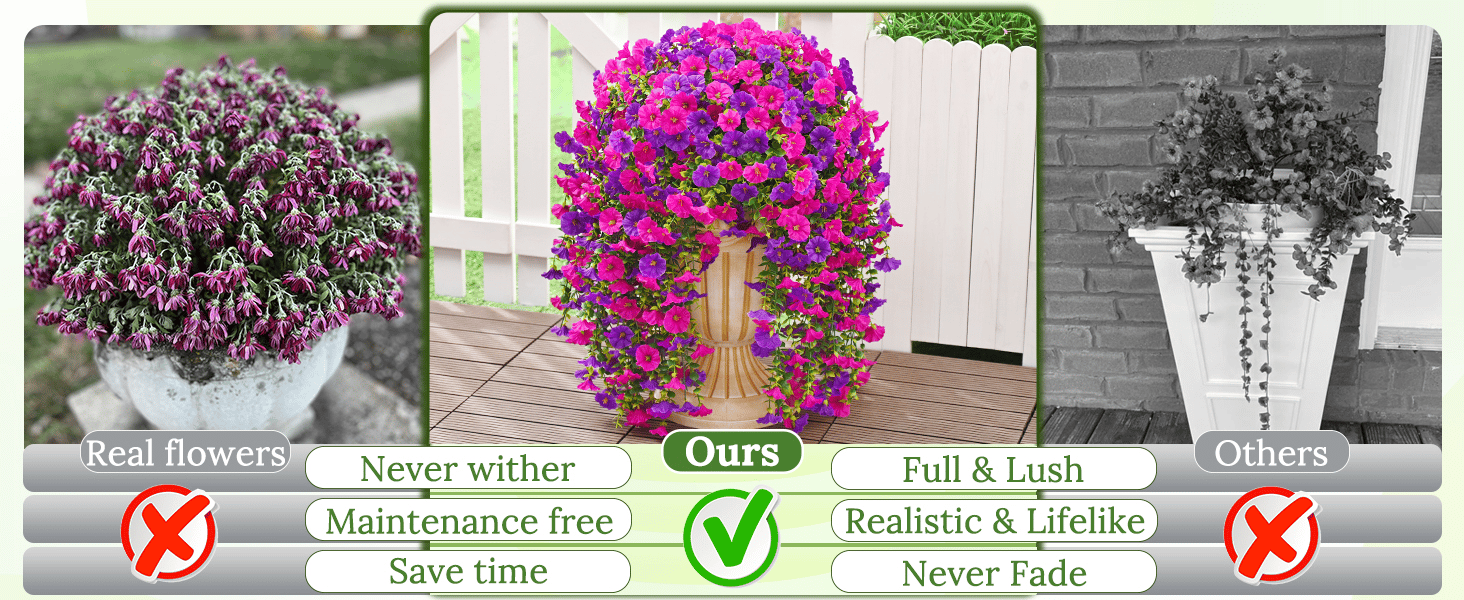 Unlike cheap plastic flowers that fade in weeks, ours areĀ UV-coatedĀ to resist sunlight damage. EnjoyĀ rich purples, pinks, and whitesĀ that stay vibrantĀ season after season!